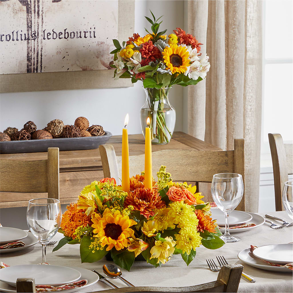 A stunning centerpiece and bouquet duo to bring autumn color to any gathering.